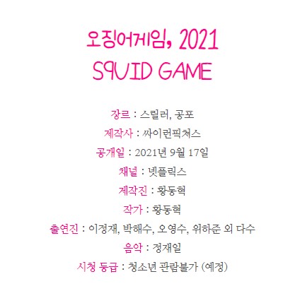 오징어게임은 9월 17일에 넷플릭스에서 공개한 드라마인데 요즘 엄청난 화제의 주인공입니다. 190개국에서 동시에 공개를 했는데, 공개하자마자 한국 드라마 중 최초로 미국 1위, 전 세계 2위를