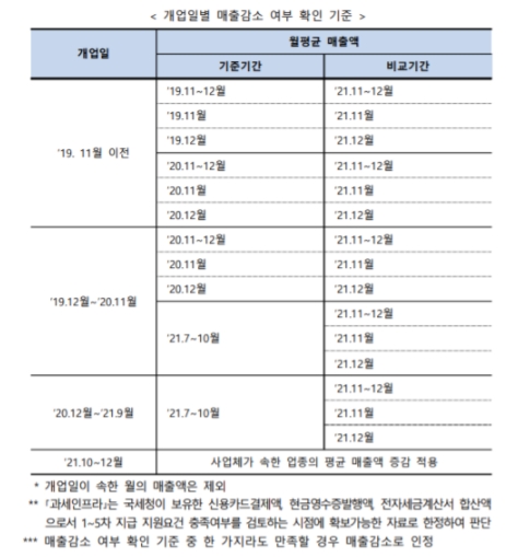 이전에 진행되었던 회차와 다른 점을 살펴보면 개업일에 따라 매출감소여부를 확인했다는 점입니다. 아래의 표에서 그 기준을 확인해 주시기 바랍니다.