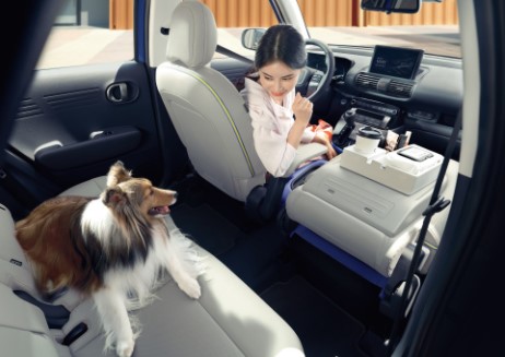 가장 특이한 점은 1열의 시트가 접힌다는 것입니다. 2열에 앉아서 1열 시트를 접은 뒤 앞으로 다리를 쭉 펼 수 있습니다. 또한 2열까지 내부 시트를 모두 접으면 비록 경차이지만 캠핑하는데 불편함이 없을 것으로 생각됩니다.